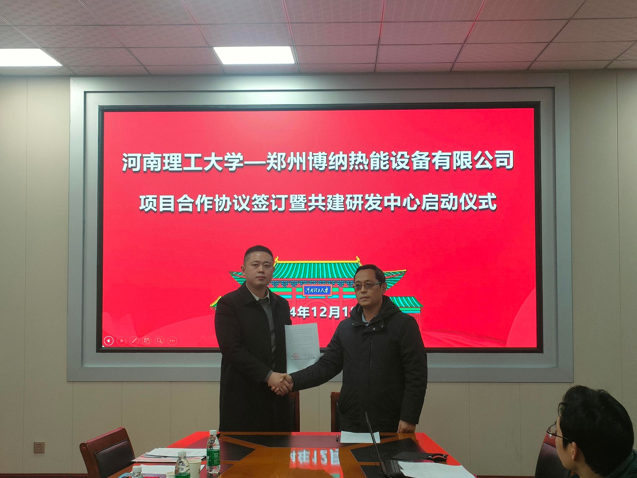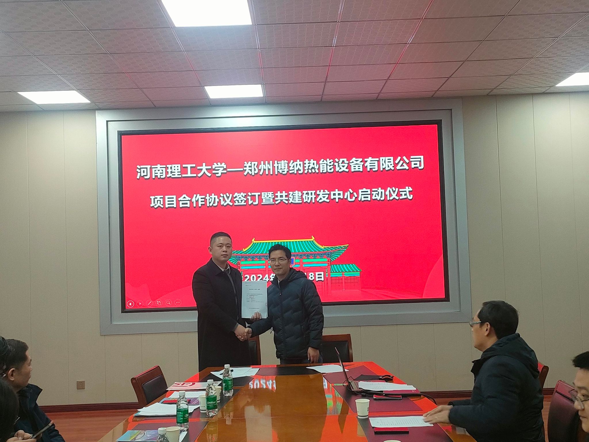 与郑州博纳热能设备有限公司项目合作协议签订暨共建研发中心启动仪式在学院204会议室举行。学院非常规能源利用与转化科研团队负责人温小萍教授、郑州博纳热能设备有限公司董事长王鑫、郑州博纳热能设备有限公司总工程师王国全,能动系主任梅艳阳、郑州博纳热能设备有限公司相关负责人、能动系相关老师共同出席了此次签约仪式。