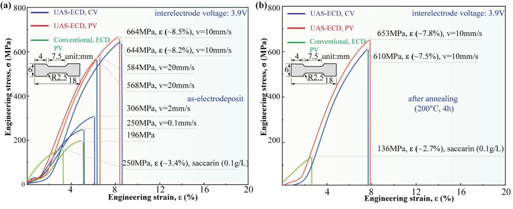 针对常规电沉积技术制备金属纳米结构材料的不足,明平美教授团队提出了一种新型电沉积技术—线阳极扫描电沉积技术(Wire Anode Scanning Electrodeposition,WAS-ECD)。该技术以超细(直径/宽度≤50μm)惰性金属丝材为阳极(线阳极),并在阴极上方极小极间间隙(≤200μm)位置往复扫描运动而实现金属电沉积。WAS-ECD技术实现了无添加剂、无脉冲电源等辅助手段下超高强度超纯纳米镍的高品质制备,制备出的纳米镍晶粒15-50nm、镍含量高达99.9997%、镀态硬度656HV、拉伸强度664MPa、断裂延伸率8.5%,兼具了高硬度、高塑性和高超纯度的优异性能。WAS-ECD技术为超高强度超纯纳米晶金属材料的制备提供了新的技术方案。