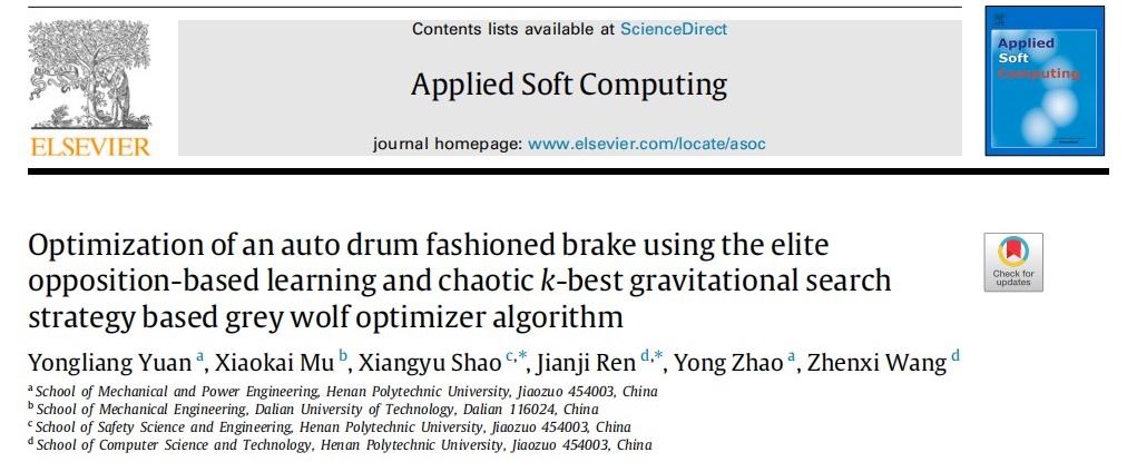 机械装备动力学与数字孪生技术科研团队的原永亮老师在国际TOP期刊《Applied Soft Computing》(影响因子8.263)发表学术论文“Optimization of an auto drum fashioned brake using the elite opposition-based learning and chaotic k-best gravitational search strategy based grey wolf optimizer algorithm”一文入选ESI高被引论文。该科研成果提出了一种改进的高效优化算法,研究了精英反向学习策略和k-best混合策略联合驱动下的灰狼优化算法性能,成果得到了本领域国内外学者的高度关注,被引频次进入到本学科领域全球前1%以内。